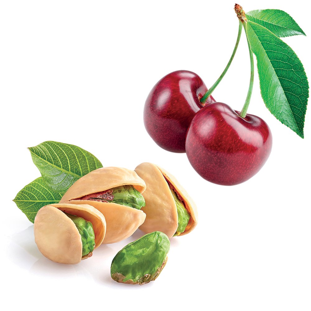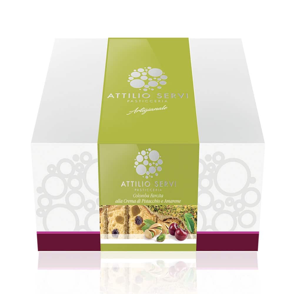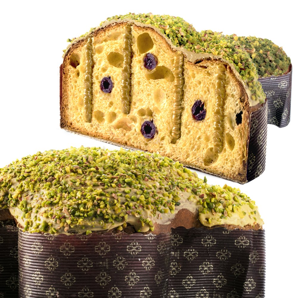Al taglio si svela una pasta soffice e bionda con una farcitura di crema al pistacchio. Per un maggior equilibrio al dolce sono state inserite le amarene, donano freschezza e un po’ di acidità al gusto. La cupola è avvolta da granella e glassa al pistacchio.